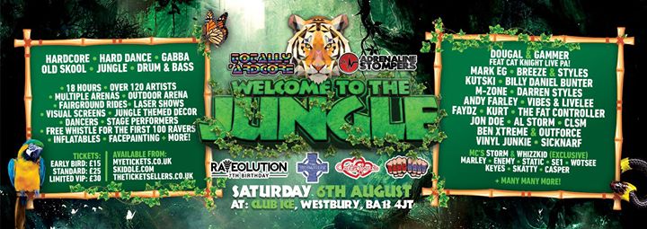 After the massive success of the first ‘Welcome to the Jungle’ event, Totally ‘Ardcore and Adrenaline Stompers join forces once again, with a selection of other leading brands from the South West (Hardcore Raveolution, the Monastery, Banghard & Contageous),to bring you an exclusive 18 hour multi-genre festival… taking the ‘Welcome to the Jungle’ concept to a whole new level!