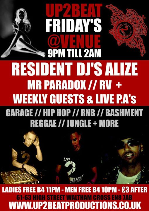 UP2BEAT FRESH NEW NIGHT EVERY FRI WITH RESIDENT DJ ALIZE , MR PARADOX & RV WEEKLY GUESTS AND LIVE PA’S ……………………………………………